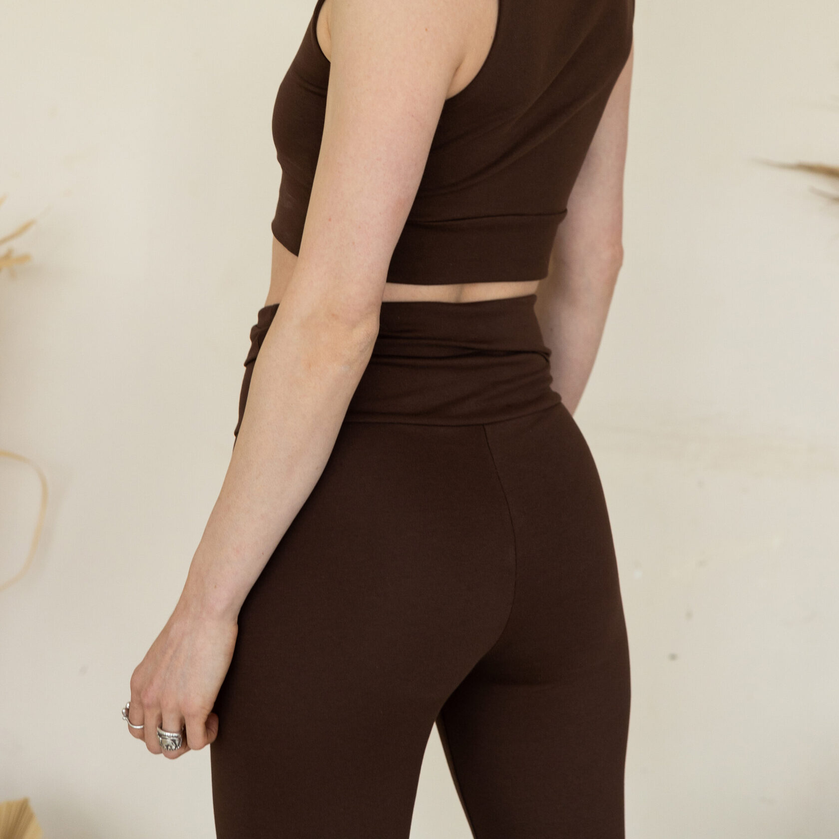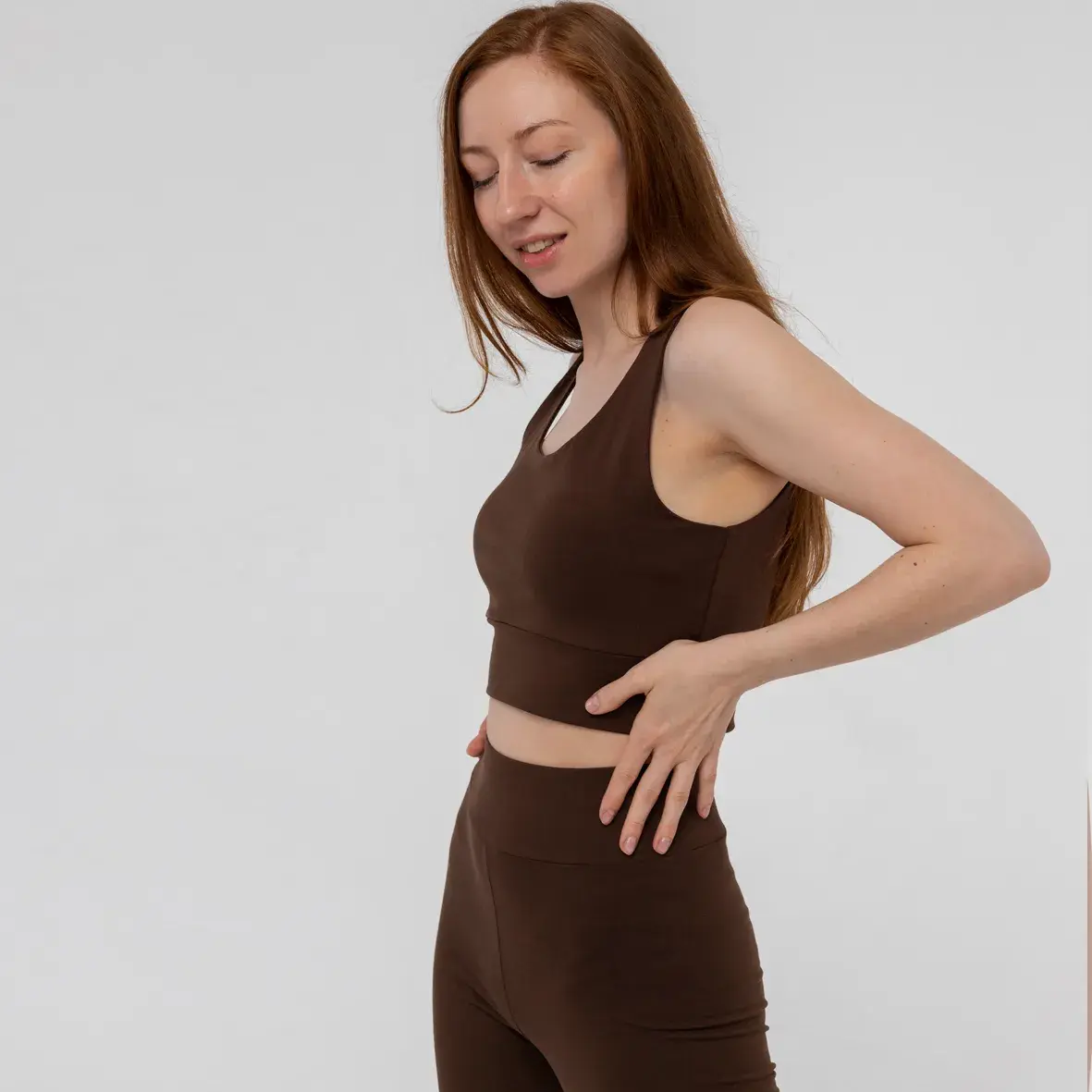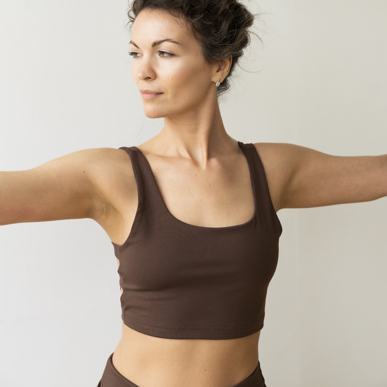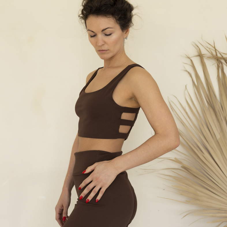 Облегающий топ из хлопка с открытой спиной коричневого цвета Кроп-топ выполнен из двух слоев ткани, не просвечивает и обеспечивает прекрасную посадку Элегантная интересная спина, облегающая посадка Пояс немного уже, чем обхват груди, сделано специально для оптимальной посадки и прилегания Комфорт на практиках или тренировках, дышащий мягкий хлопок, не стесняющий движений Прекрасный вариант не только для повседневной носки, но и для йоги, спорта