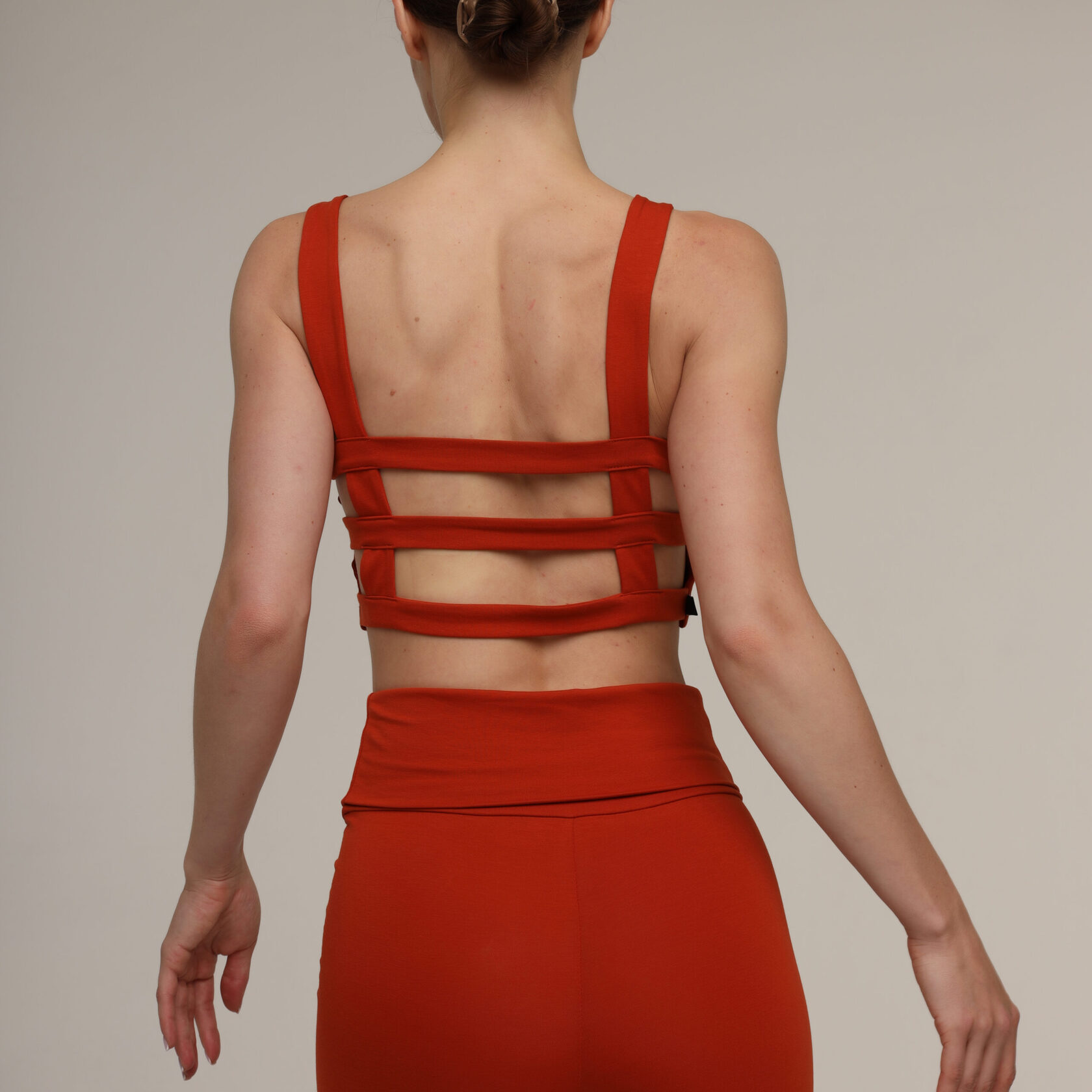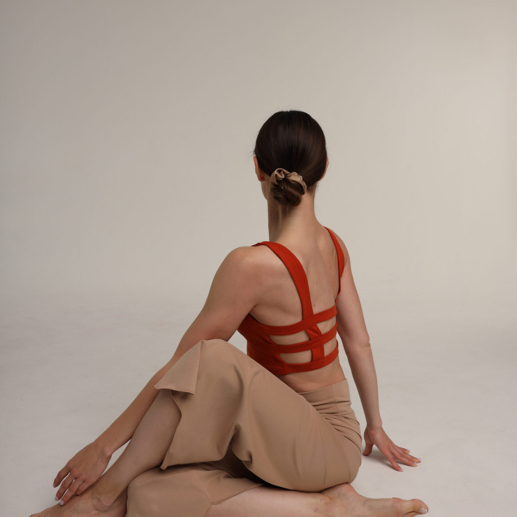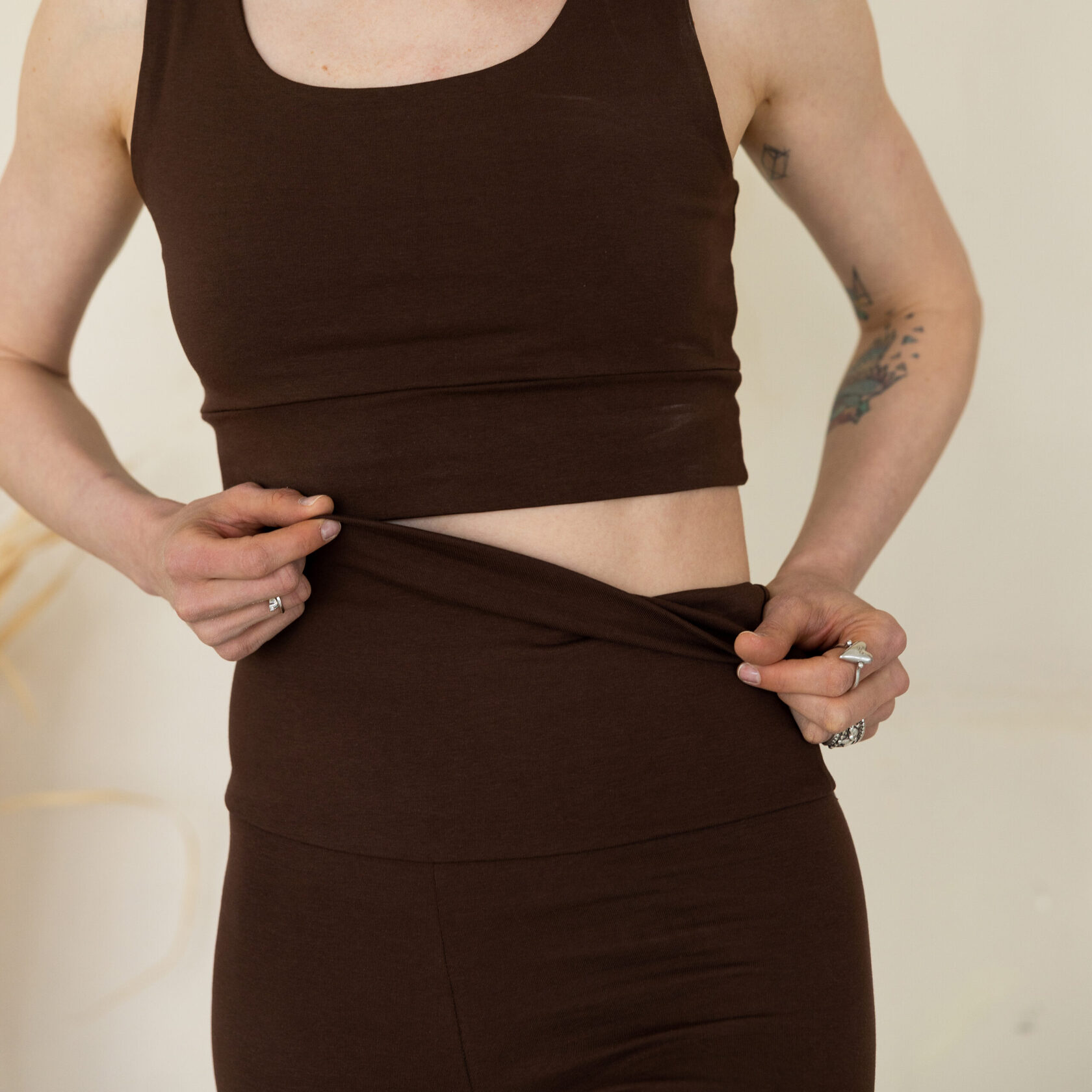 Облегающий топ из хлопка с открытой спиной коричневого цвета Кроп-топ выполнен из двух слоев ткани, не просвечивает и обеспечивает прекрасную посадку Элегантная интересная спина, облегающая посадка Пояс немного уже, чем обхват груди, сделано специально для оптимальной посадки и прилегания Комфорт на практиках или тренировках, дышащий мягкий хлопок, не стесняющий движений Прекрасный вариант не только для повседневной носки, но и для йоги, спорта
