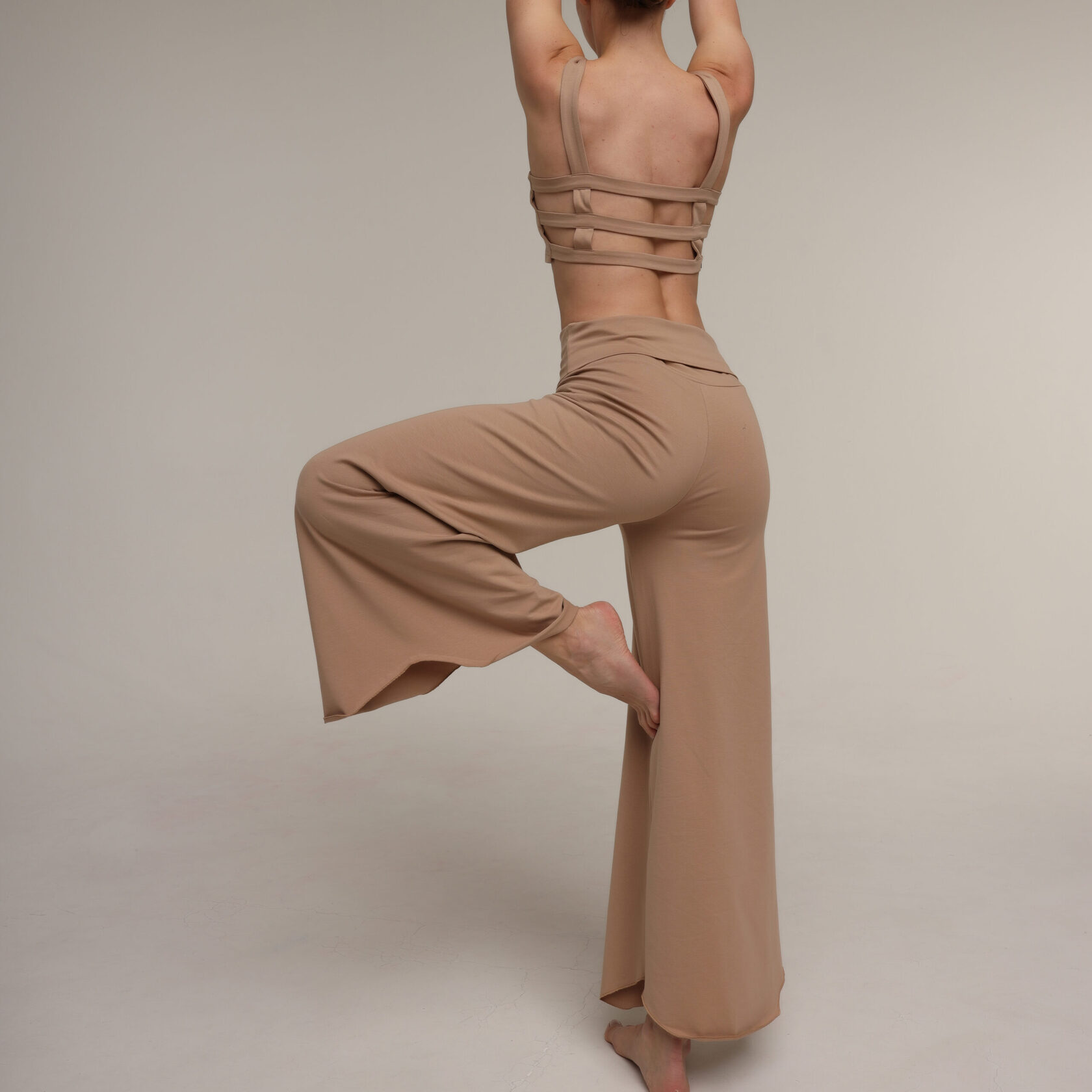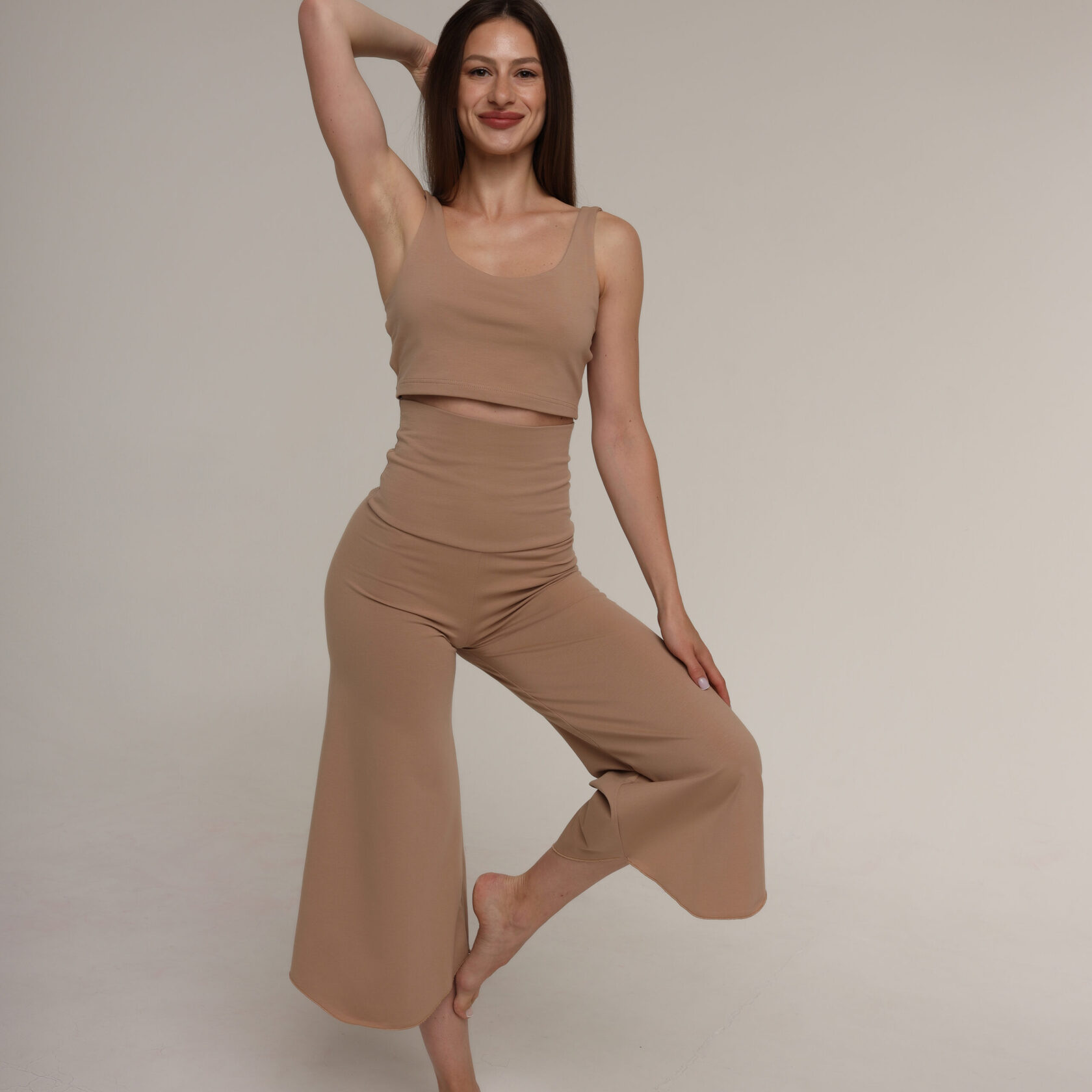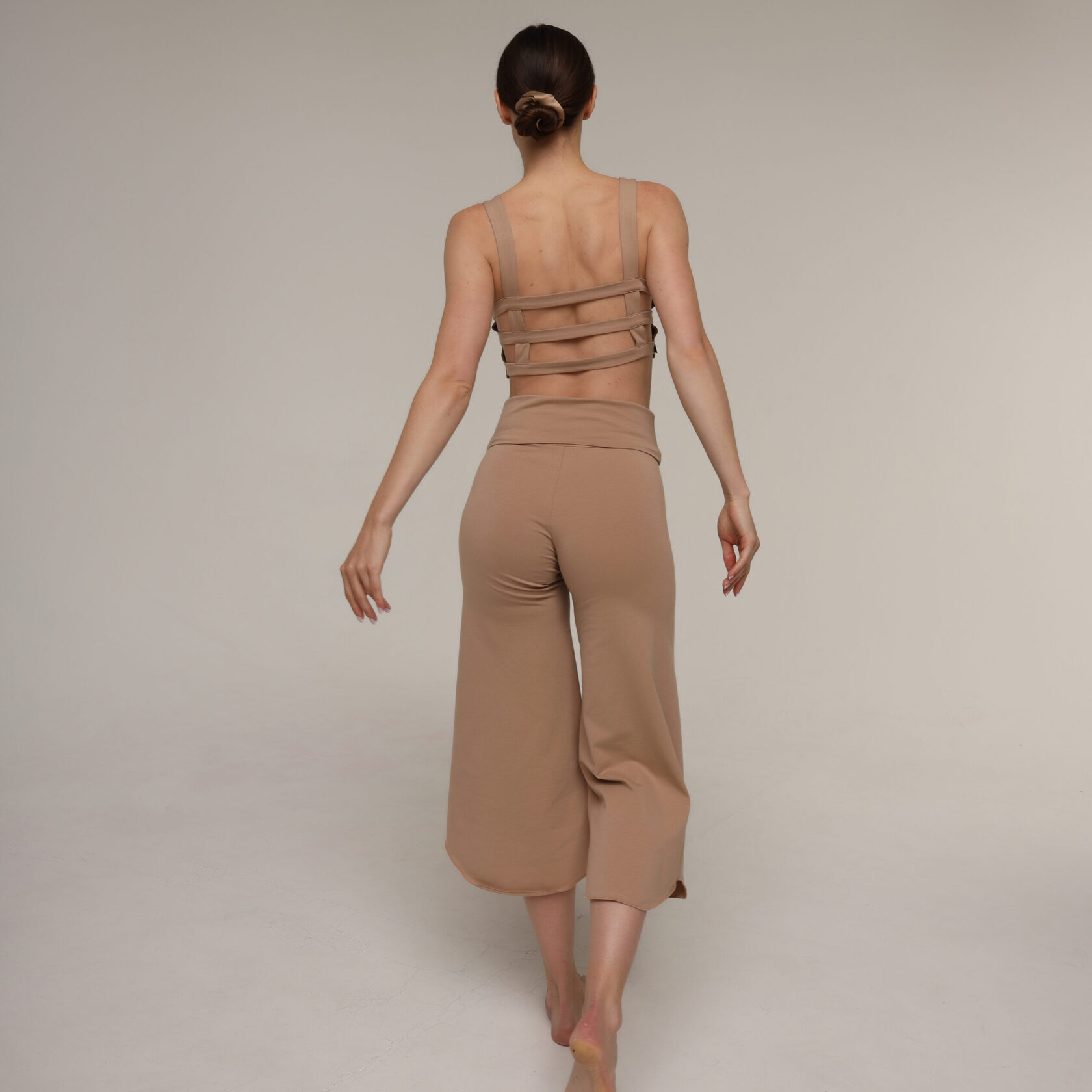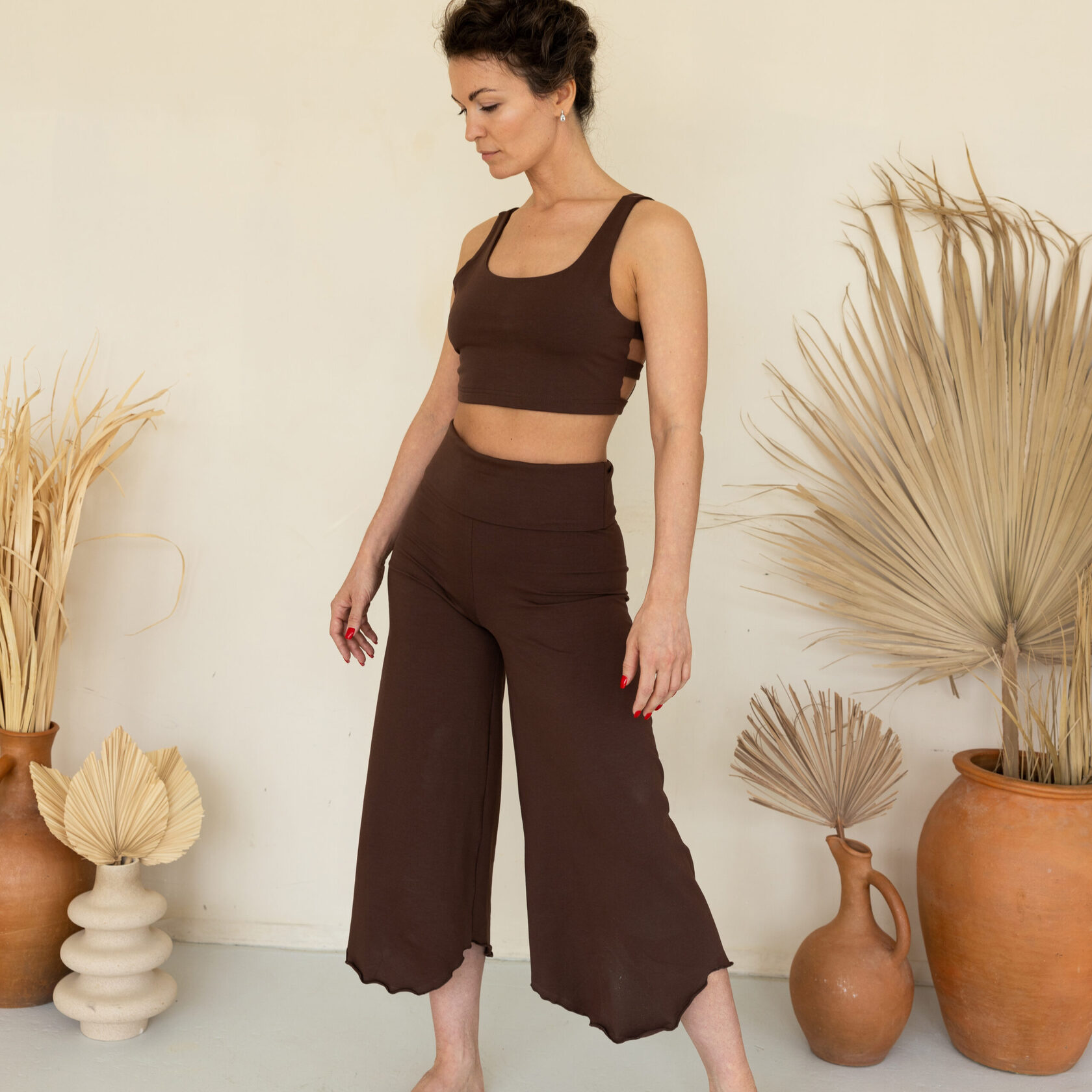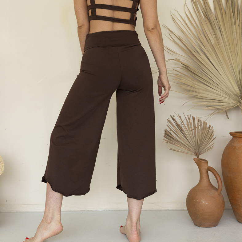 Женские свободные кюлоты из хлопка коричневого цвета Струящиеся, легкие кюлоты из мягкого эластичного хлопка с минимальным содержанием лайкры и высокой посадкой Материал плотный, классно смотрится также с лонгсливом или футболкой, худи Широкий фиксирующий пояс, без резинки внутри, можно загибать в 2 раза Также подходит для беременных Отсутствие бокового шва Комфорт на практиках или тренировках, дышащий хлопок, не стесняющий движений Прекрасный вариант для йоги,практик, спорта и базового летнего гардероба