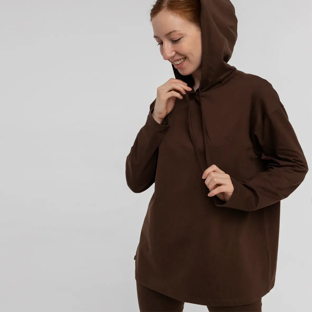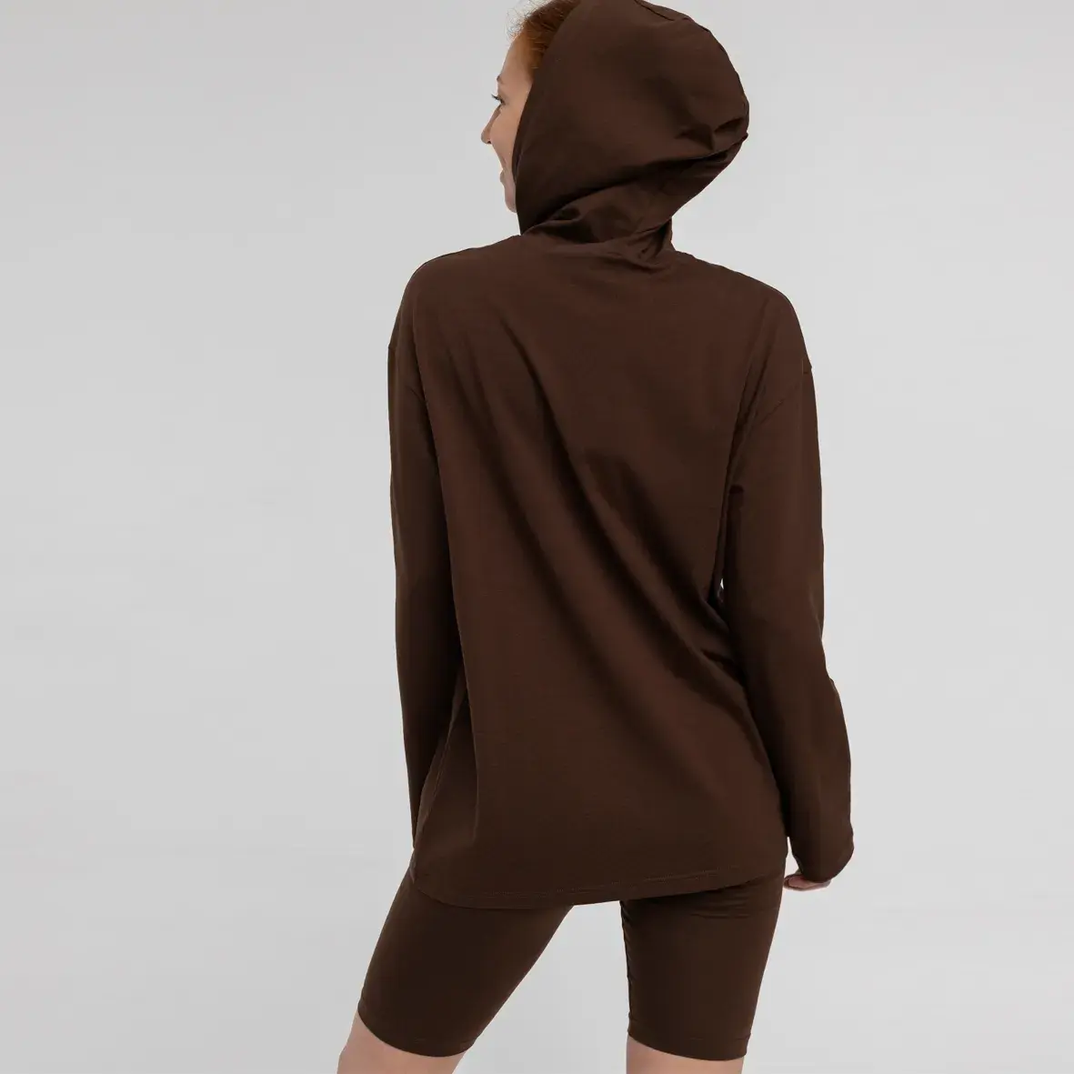 Лонгслив оверсайз из хлопка коричневого цвета с капюшоном Прямой широкий крой Длинный рукав, расширенный ворот Капюшон с хлопковым шнурком тон в тон Фирменная этикетка сбоку Мягкая плотная ткань Прекрасная основа для базового гардероба Один, универсальный размер, подходит на размеры от 40 до 52