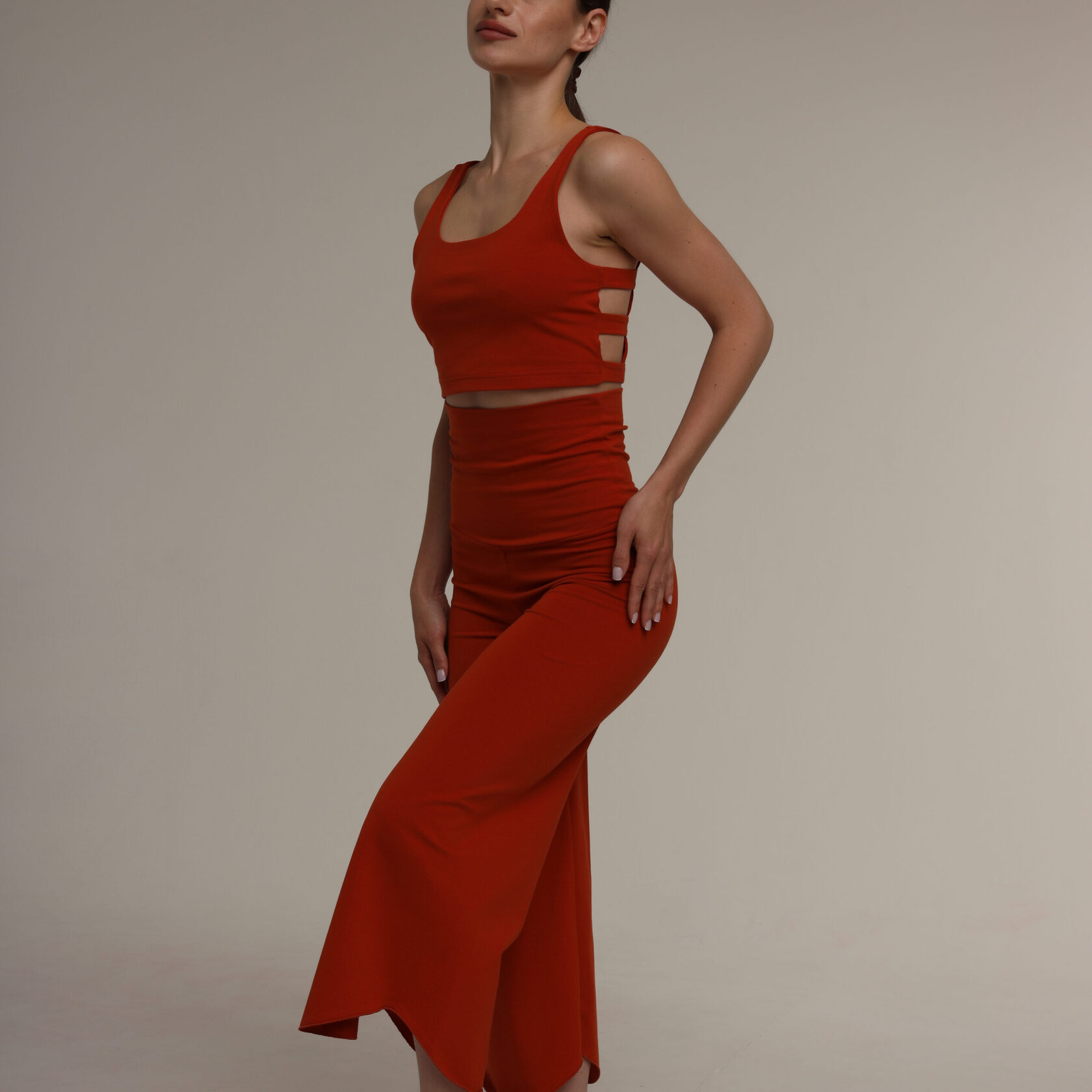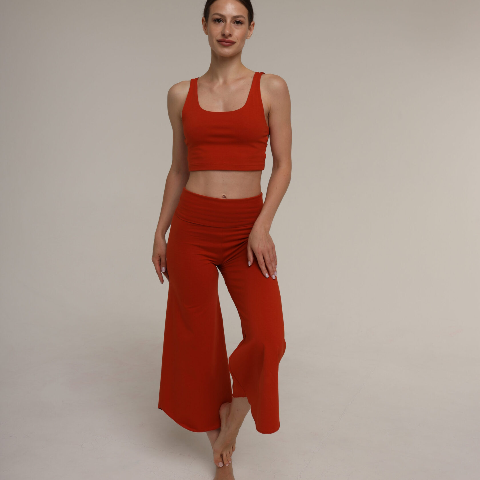 Женские свободные кюлоты из хлопка яркого цвета терракот Струящиеся, легкие кюлоты из мягкого эластичного хлопка с минимальным содержанием лайкры и высокой посадкой Материал плотный, классно смотрится также с лонгсливом или футболкой, худи Широкий фиксирующий пояс, без резинки внутри, можно загибать в 2 раза Также подходит для беременных Отсутствие бокового шва Комфорт на практиках или тренировках, дышащий хлопок, не стесняющий движений Прекрасный вариант для йоги,практик, спорта и базового летнего гардероба